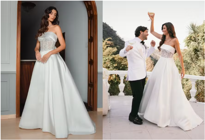 Yasmin subiu ao altar com uma silhueta de princesa moderna, em um vestido estruturado de alfaiataria minimalista e renda bordada, que remetia a uma leitura contemporânea do clássico. Assim que começou a festa, o look ganhou nova vida: a atriz revelou um modelo bordado à mão com cristais, paetês e vidrilhos, trazendo o brilho e a sensualidade típicos de seus visuais de red carpet. A peça, com saia removível, foi desenhada especialmente para refletir as duas facetas da artista — a noiva romântica e a estrela de cinema.