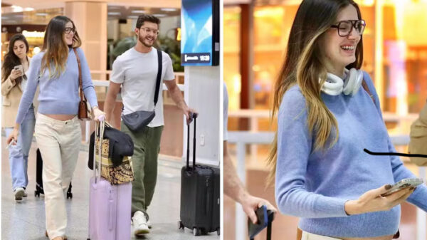 Camila Queiroz exibe barriguinha da primeira filha ao embarcar com Klebber Toledo