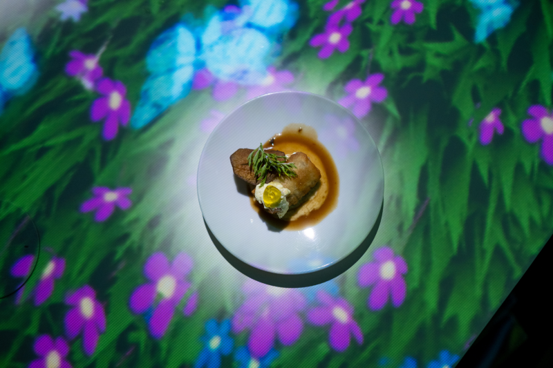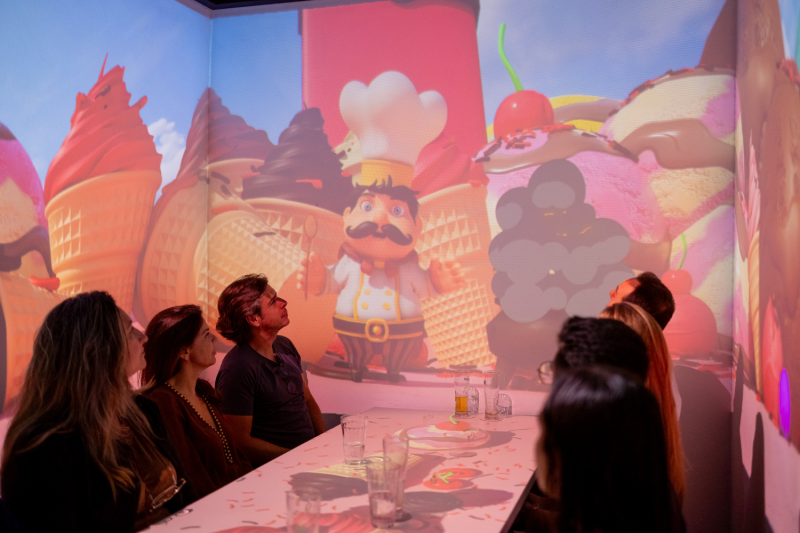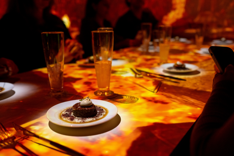 O primeiro projeto do gênero no país, chamado O Alaric, funciona em São Paulo e une alta gastronomia, cenografia digital e storytelling. São duas horas de experiência com oito pratos criativos, servidos em sincronia com projeções que tomam conta da mesa e das paredes. Entre as criações do chef Cadu Alves estão marshmallow de limão siciliano, gema de maracujá, espuma de leite de tigre e até uvas gaseificadas. Cada prato é pensado para surpreender e criar memórias, conectando sabor, imagem e som.