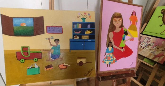 Já Maria Brandão constrói uma narrativa visual que exalta a fauna e a flora brasileiras, integrando elementos do folclore nacional e ressaltando a mulher como guardiã da memória e da tradição.