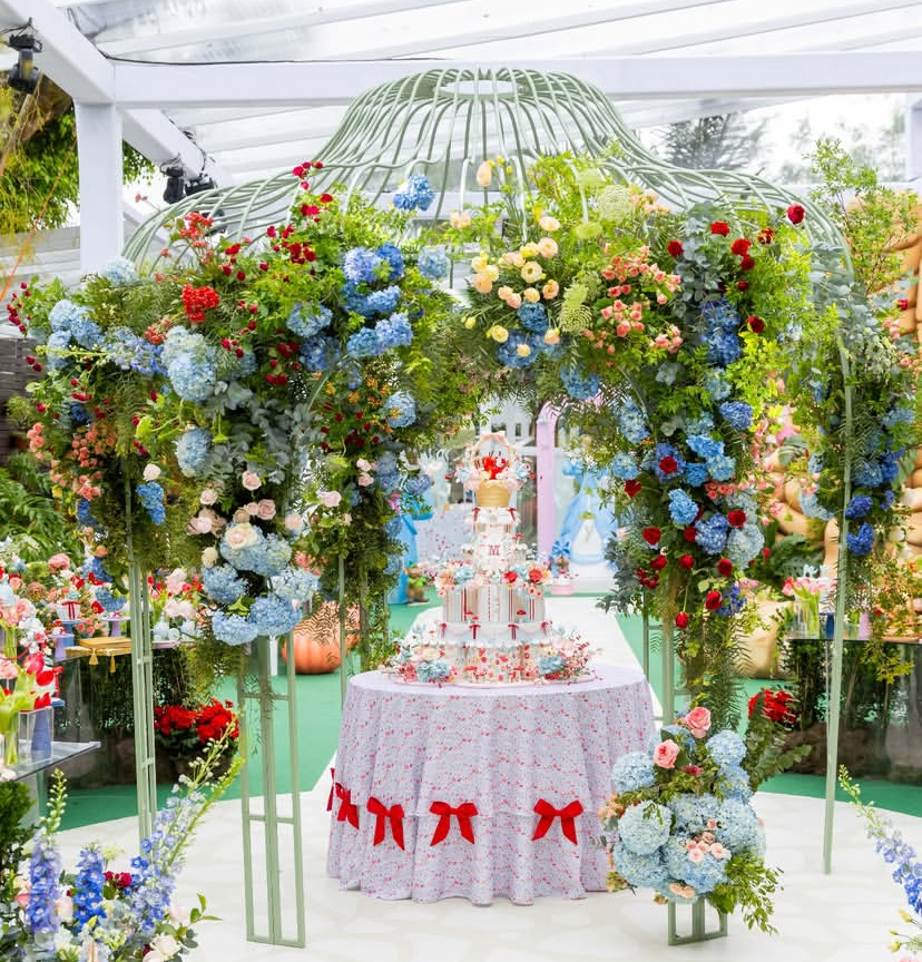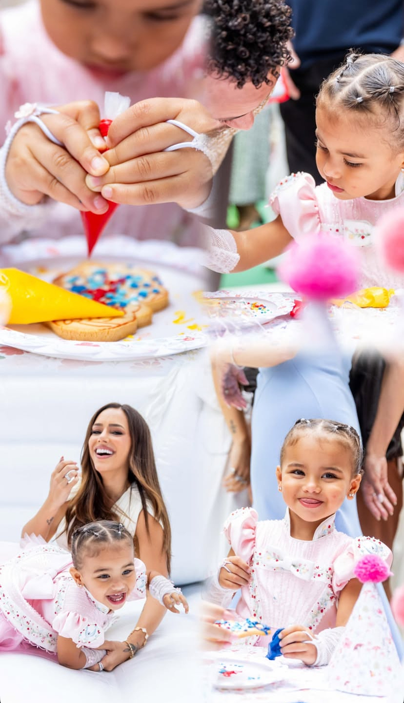 O casal optou por uma comemoração voltada para as crianças, com decoração inspirada nos clássicos da Disney, incluindo castelos, painéis cenográficos e cores suaves. A festa trouxe um clima mágico e intimista, diferente das grandes celebrações com atrações para adultos.