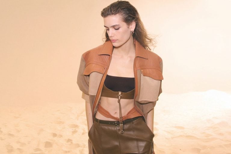 As curvas sinuosas de uma sela do arquivo da marca – proveniente de Camargue –, assim como as costuras precisas no couro e a forma como a peça envolve o animal, servem como inspiração para os acessórios de couro que vão sobre o peitoral feminino, feito corsets, que trazem para os looks a ideia de “abraçar a independência”. Além disso, as formas simbolizam a excelência no savoir faire em selaria, atividade que ajuda a contar a história da Hermès desde 1837. Parfait!