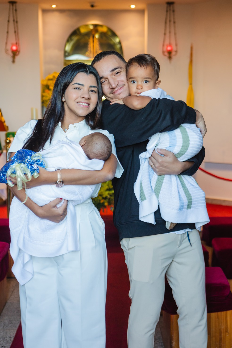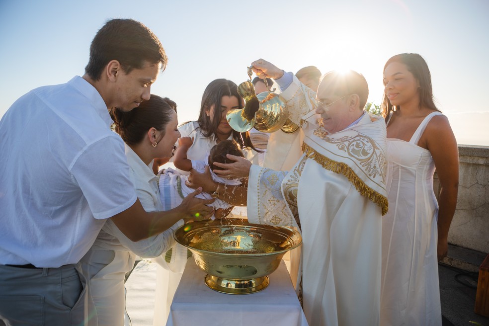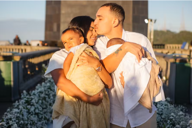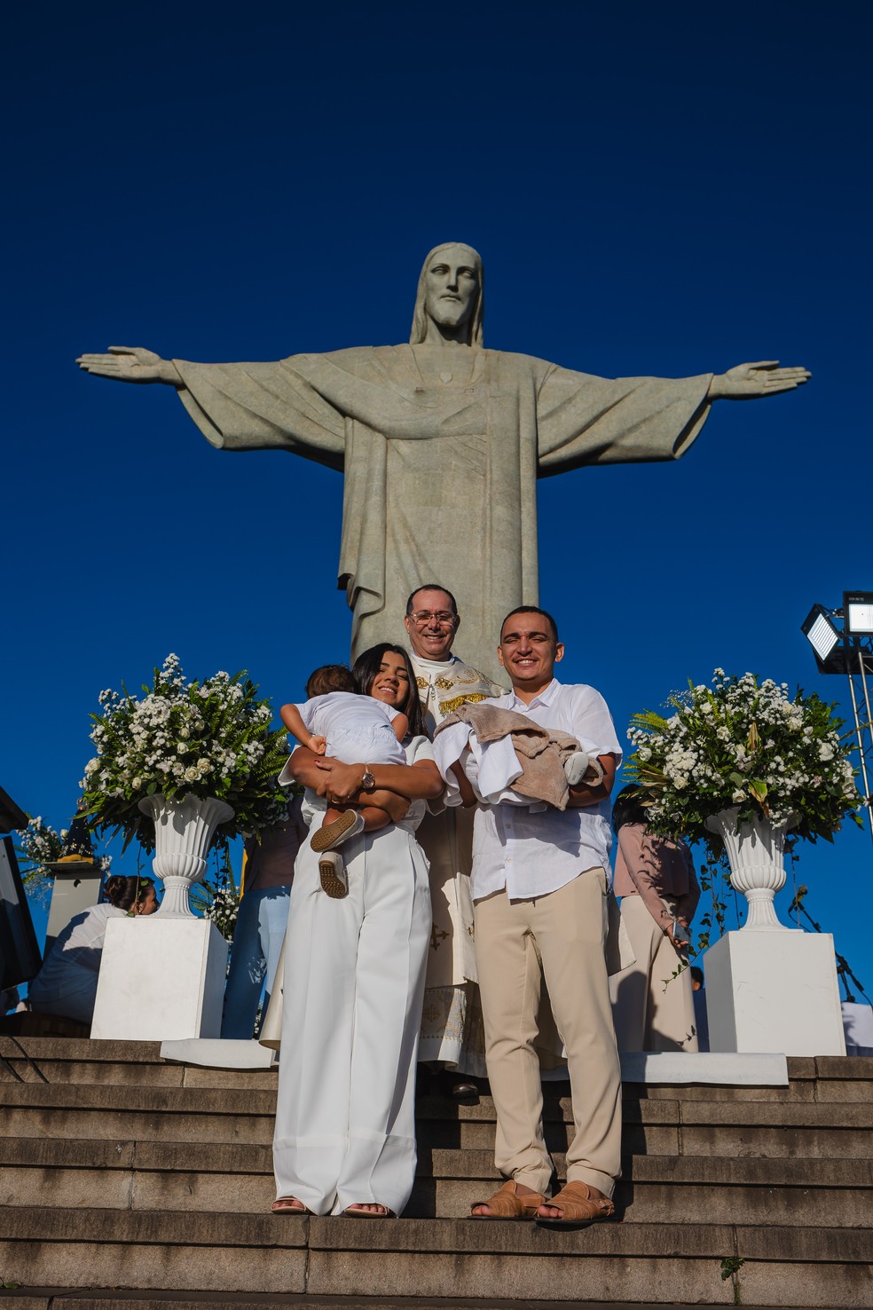 João Gomes e Ary Mirelle, ambos com 23 anos, realizaram o batizado de seus filhos, Jorge (1 ano) e Joaquim (nascido no início de setembro), no Cristo Redentor, no Rio de Janeiro, nesta terça-feira (21). Na mesma celebração, o casal aproveitou para comemorar seu primeiro ano de casamento, renovando seus votos matrimoniais.