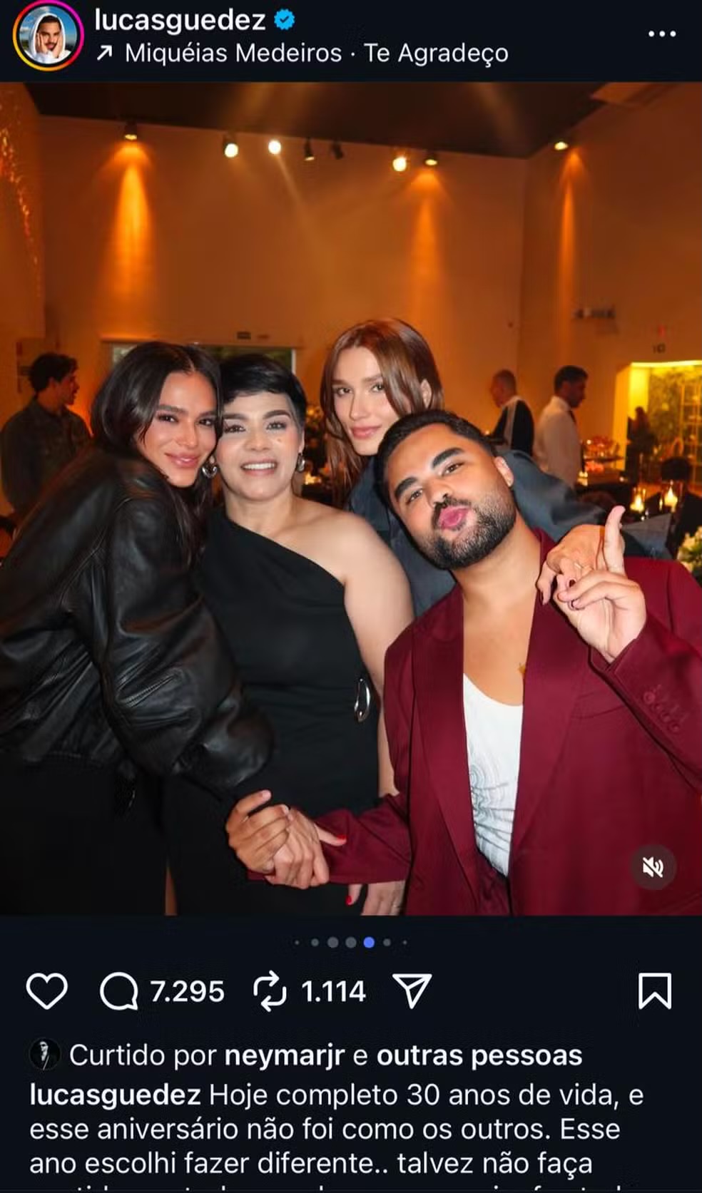 O jogador Neymar, de 33 anos, chamou atenção nesta segunda-feira (15) ao curtir uma publicação nas redes sociais em que Bruna Marquezine aparece. O post foi feito por Lucas Guedez, que comemorou seu aniversário de 30 anos no domingo (14), com a presença da atriz e de outros famosos.
