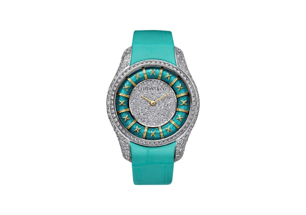 O novo relógio se destaca pelo acabamento em platina polida e pelo mostrador na cor azul característica da Tiffany. O visor recebe aplicação de diamantes em corte baguete e ponteiros em ouro branco, elementos que reforçam a ligação direta com a joalheria de luxo.