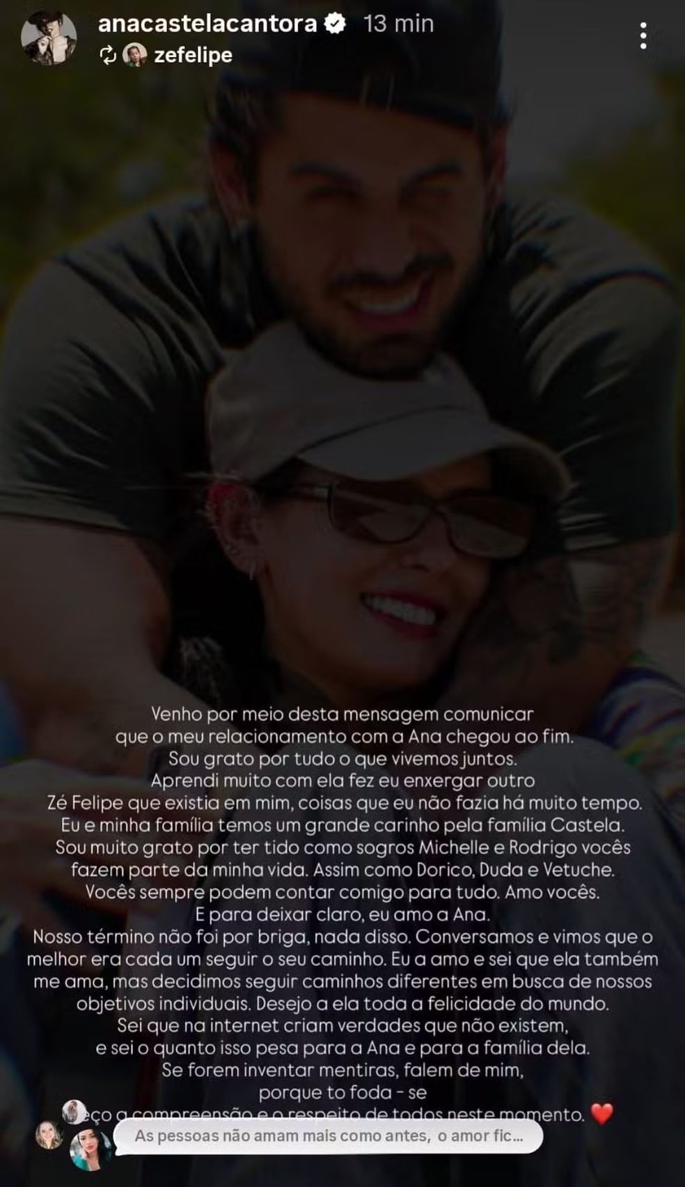 Em seus Stories do Instagram, Zé Felipe escreveu que o término não ocorreu por brigas, mas por decisão mútua de seguirem caminhos individuais. Ele reforçou que mantém carinho pela família de Ana e que continuará disponível para eles, destacando: “Amo a Ana e sei que ela também me ama, mas decidimos seguir caminhos diferentes em busca de nossos objetivos individuais”.